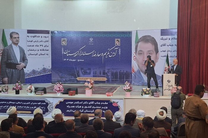 در این آیین، از خدمات سه ساله اسماعیل زارعی کوشا تجلیل و آرش زرهتن لهونی به عنوان استاندار جدید کردستان معرفی شد.